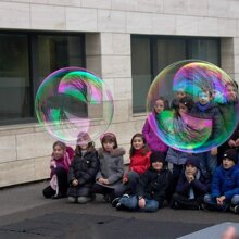 Liquidi scherzosi contro bolle rivestite dai colori dell'arcobaleno che attirano ovunque su di se gli sguardi incantati e le mani giocose. La fantasia e l'immaginario di ogni bambino sono stimolati dall'ascolto e dal racconto.